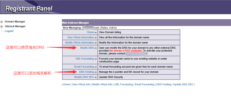 3.进入域名管理页面,点击Modify DNS可以修改域名DNS 比如使用cloudflare的CDN服务器 可以再这里修改域名DNS,DNShosting可以添加A记录 MX记录
